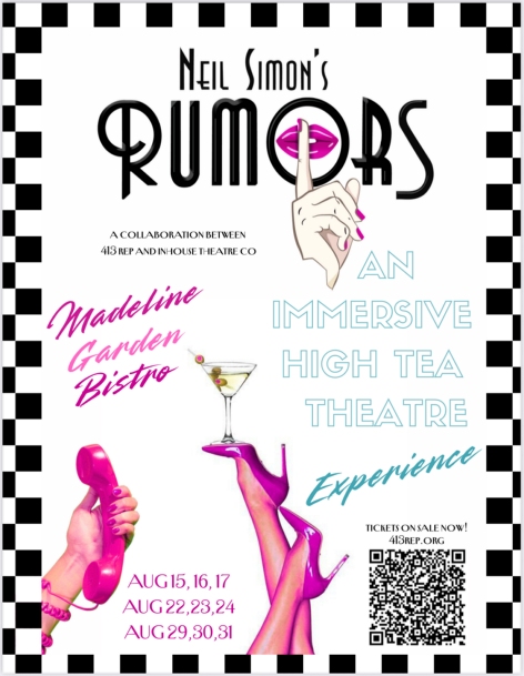 While you eat, a production of Neil Simon's classic, farcical comedy, 'Rumors' will play out around you. You will not be participating in the show- don't worry!